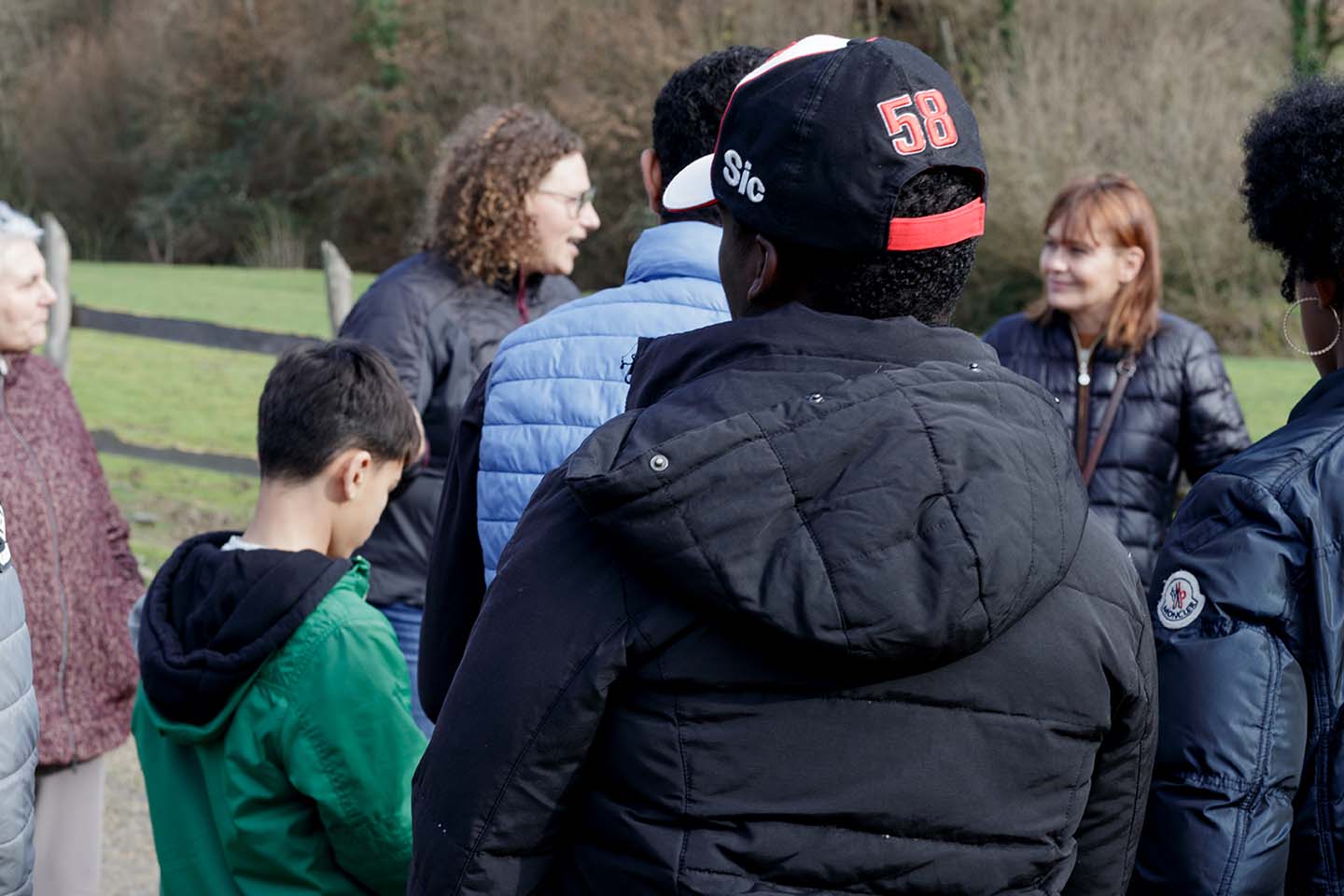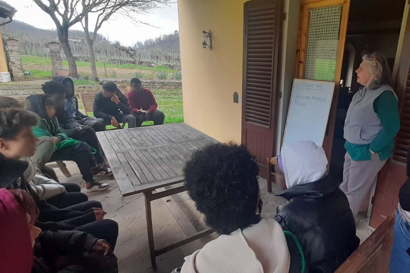 I ragazzi in da subito ci sono parsi molto educati, curiosi e rispettosi, un gruppo coeso di maschi e di femmine che si conoscevano già bene tra loro. Siamo andati in un terreno di Antonio e Valentina che attualmente è gestito da Carlotta, che accoglie un allevamento di “animali sottratti ad un stato di difficoltà”. Asini, un cavallo, una scrofa di cinta senese che si crede di essere un cane da guardia, un cane, tre gatti, una gallina che al posto delle piume aveva un pelo lungo come un ermellino bianco; una capra che da quando è scampata al morso di un lupo va in giro sempre a testa alta.